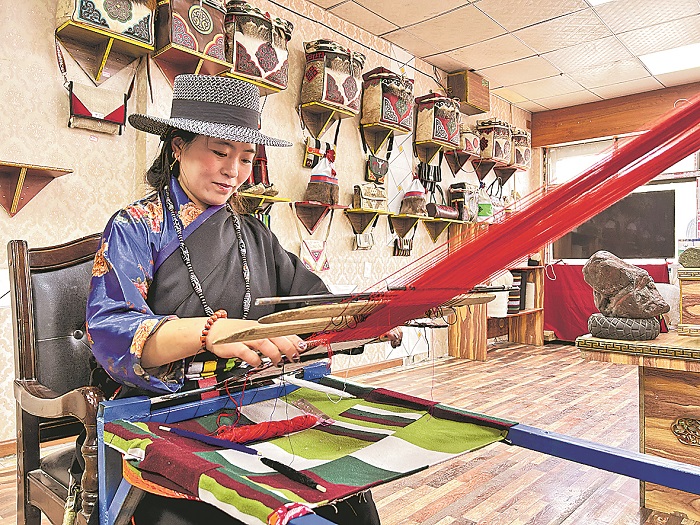 9月11日,在西藏自治區那曲市比如縣恰則鄉曲榮奪村水磨糌粑合作社,大廳里掛滿了樣式新穎、造型別致的藏式包、糌粑袋、門簾等手工藝品。35歲的村民央嘎正在用傳統藏式編織工藝制作藏服腰帶。