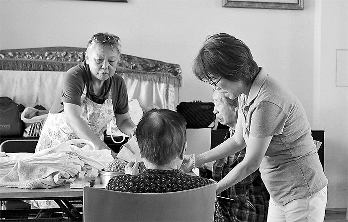 金恩京(右一)在海馬記憶工房和老人一起做手工。本報記者 史宏宇 攝