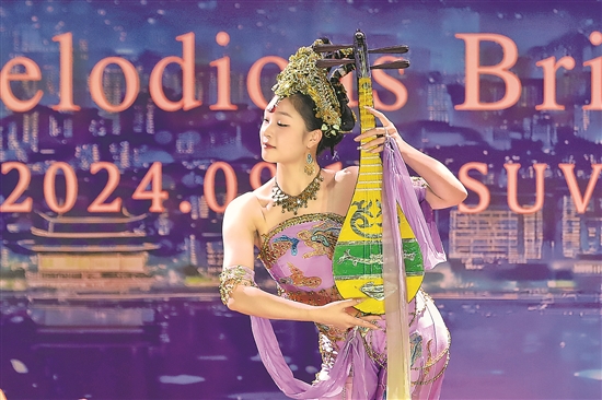 圖為當地時間9月17日,在斐濟蘇瓦市政廳,演員在“知音湖北·遇見斐濟——天涯共此時中秋晚會”上表演。新華社發(桑欽龍 攝)