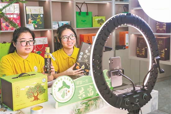 圖為9月19日,主播在銷售香榧及香榧油、香榧酒、香榧皂等衍生產品。