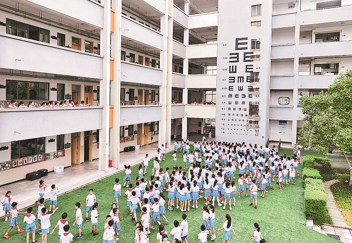 據(jù)了解,為提醒學(xué)生保護好眼睛,該校在新學(xué)期開學(xué)前就在教學(xué)樓墻壁上粘貼了一個巨型視力表,約有4層樓高。該校校長說,設(shè)置這個巨型視力表主要起到提醒的作用,孩子們在教學(xué)樓、操場上不經(jīng)意間就能看到它,潛移默化中提醒學(xué)生保護好自己的眼睛。而且,站在遠處的測試點,學(xué)生隨時可以檢測視力,了解自己的視力狀況。