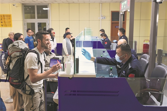 9月20日,在新疆紅其拉甫口岸聯檢大廳,新疆邊檢總站紅其拉甫邊檢站民警正在為入境旅客辦理入關手續。