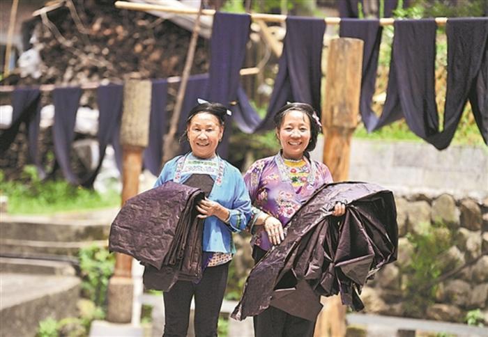 在融水苗族自治縣桿洞鄉(xiāng)黨鳩村烏英苗寨,48歲的苗族婦女梁足英(右)和71歲的母親梁英迷在展示剛剛做好的亮布。亮布是當(dāng)?shù)孛缱鍌鹘y(tǒng)手工布料,梁足英從小就跟著母親梁英迷學(xué)習(xí)捶亮布,如今每年她們都在一起制作亮布。
