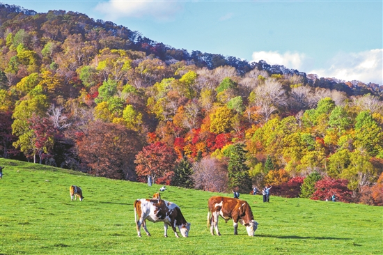 該景區位于臨江市崇山峻嶺之中,四周是一片遼闊草原,茂密的森林環繞著景區,營造出一種遠離喧囂的寧靜氛圍。站在山頂,可欣賞到層林盡染的秋日美景。五彩斑斕的景色與悠閑的牛羊相映成趣,構成一幅令人向往的田園牧歌畫面,吸引游客駐足觀賞。