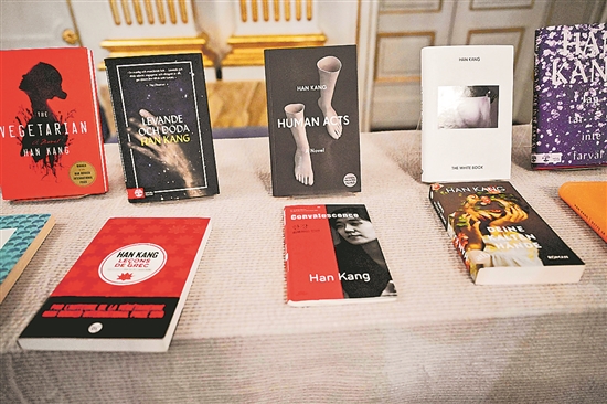 當(dāng)?shù)貢r(shí)間10月10日,瑞典斯德哥爾摩,在瑞典文學(xué)院,韓國作家韓江被宣布為2024年諾貝爾文學(xué)獎(jiǎng)得主。她的作品直面歷史創(chuàng)傷,揭露人類生命的脆弱性。瑞典文學(xué)院表示,她“因其直面歷史創(chuàng)傷、揭露人類生命脆弱性的強(qiáng)烈詩意散文”而獲獎(jiǎng)。圖為韓江的作品正在展出。視覺中國 供圖