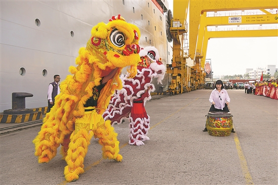 當地時間10月12日,人們在孟加拉國吉大港表演舞獅歡迎中國海軍戚繼光艦、井岡山艦到訪孟加拉國。
