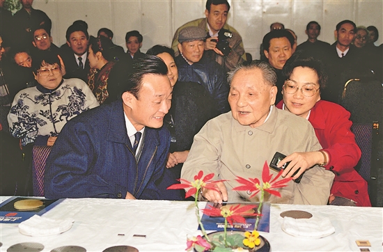 1992年2月10日,鄧小平同志在上海貝嶺微電子制造有限公司參觀時與吳邦國同志交談。新華社記者 柳中央 攝