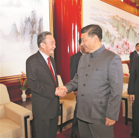 2021年7月1日,慶祝中國共產黨成立100周年大會在北京天安門廣場隆重舉行。這是慶祝大會前,習近平同志與吳邦國同志握手。新華社記者 鞠鵬 攝