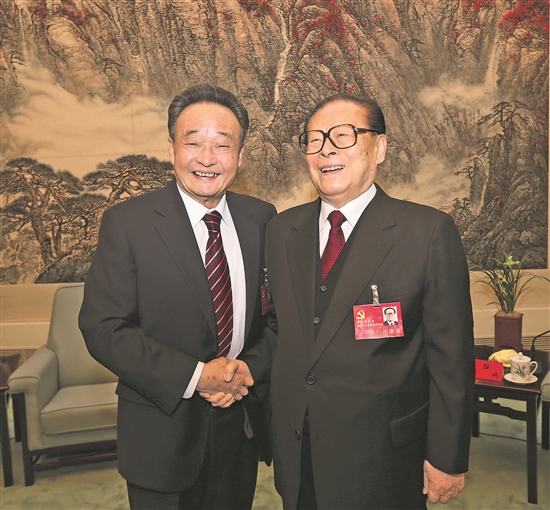 2012年11月14日,中國共產黨第十八次全國代表大會在北京閉幕。這是閉幕會前,江澤民同志與吳邦國同志在一起。新華社記者 蘭紅光 攝