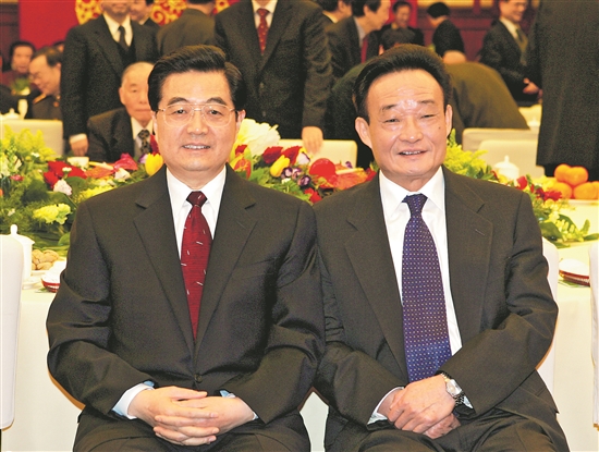 二〇〇五年一月一日,全國政協在北京舉行新年茶話會。這是胡錦濤同志與吳邦國同志在一起。新華社記者 樊如鈞 攝