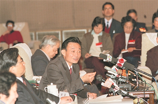 1994年3月,時任上海市委書記的吳邦國同志在全國兩會上海代表團全團會議上。新華社記者 劉建國 攝