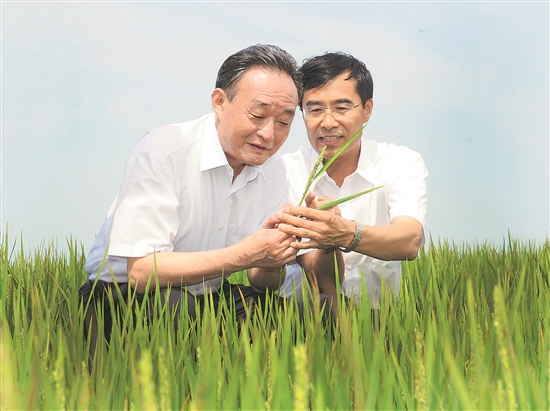 二〇一二年七月十九日,吳邦國同志在黑龍江農墾建三江管理局二道河農場萬畝大地號察看水稻長勢。新華社記者 謝環馳 攝