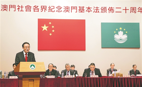 2013年2月21日,吳邦國同志在澳門文化中心出席澳門社會各界紀念澳門基本法頒布20周年啟動大會并發表講話。新華社記者 鞠鵬 攝