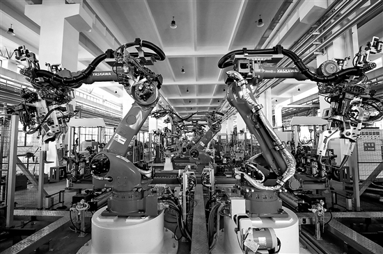 位于江蘇省揚州市江都區(qū)的揚州市洪泉實業(yè)有限公司智能生產(chǎn)車間,機(jī)器人正在作業(yè)。