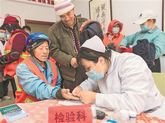 醫(yī)務(wù)人員現(xiàn)場為環(huán)衛(wèi)工人把脈問診,檢查身體,測血壓、血糖等,并針對他們的工作特點,增加了心肺聽診、心電圖、中醫(yī)體質(zhì)辨識等項目,為一線環(huán)衛(wèi)工人送上健康關(guān)懷。本報通訊員 張力濤 攝