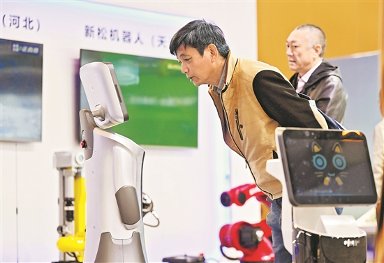 10月25日,在2024京津冀產(chǎn)業(yè)鏈供應(yīng)鏈大會(huì)開(kāi)幕式會(huì)場(chǎng)外設(shè)置的企業(yè)推介展區(qū),與會(huì)嘉賓與一款服務(wù)機(jī)器人互動(dòng)。
