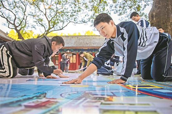 10月22日下午,首場“民族團結(jié)心相映 京澳共話愛國情” 主題的快拼快閃活動在北京市第十三中學舉行。在場學生共同完成一幅長20米、高4米的巨型拼圖。圖為校園內(nèi)師生協(xié)力完成拼圖。