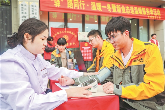 11月4日,浙江省湖州市長興縣總工會開展新業態送溫暖服務季活動,先后在全縣12個工會驛站設置愛心攤位,現場為戶外勞動者和新就業形態勞動者提供免費理發、中醫問診、法律援助等服務,并送上保暖防寒用品,為勞動者帶來暖心關愛。本報通訊員 吳拯 攝