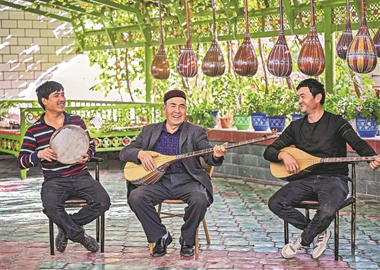 努爾東·司馬義(中)和兒子艾合買提·努爾東(左)、徒弟一起演奏樂曲。
