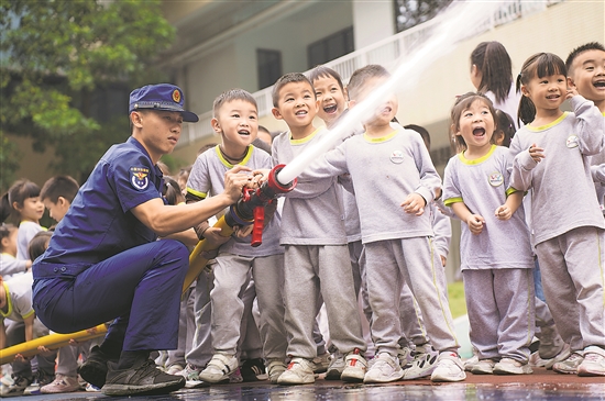 11月5日,在福建省龍巖市新羅區(qū)西陂街道一家幼兒園,小朋友在消防員的指導下體驗消防水槍射水。在全國消防日來臨之際,各地舉行豐富多彩的消防宣傳教育活動,幫助人們學習消防知識,提升安全意識。新華社發(fā)(周楊東 攝)