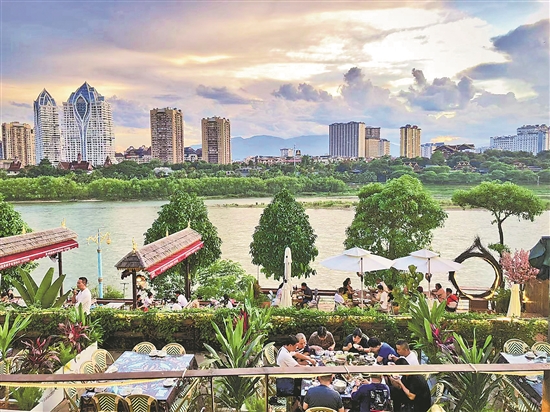 日落時分,在云南省西雙版納州景洪市瀾滄江邊,游客們邊欣賞江景邊享受美食。