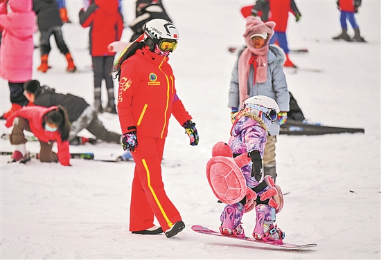 近日,孩子們在家長帶領下來到內蒙古呼倫貝爾市扎蘭屯市金龍山雪場練習滑雪。新華社記者 連振 攝