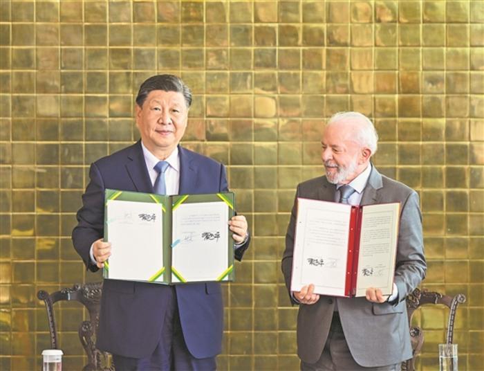 我們就中巴關(guān)系未來發(fā)展達(dá)成新的戰(zhàn)略共識(shí),其中最重要的是,我們共同決定將雙邊關(guān)系提升為攜手構(gòu)建更公正世界和更可持續(xù)星球的中巴命運(yùn)共同體,同時(shí)將共建“一帶一路”倡議同巴西發(fā)展戰(zhàn)略對(duì)接。在世界格局加速演變的背景下,這體現(xiàn)了中巴兩個(gè)發(fā)展中大國識(shí)變、應(yīng)變、求變的決心,必將推動(dòng)兩國關(guān)系繼往開來、開啟下一個(gè)“黃金50年”,同時(shí)為全球南方國家團(tuán)結(jié)自強(qiáng)樹立榜樣,為提升發(fā)展中國家在全球治理中的代表性和發(fā)言權(quán)作出新的貢獻(xiàn)。