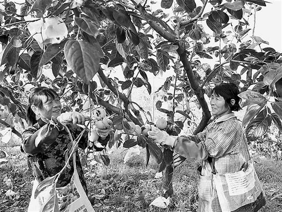 浙江省江山市峽口鎮探索建立“柿柿如意”共富工坊,吸收周邊剩余勞動力約50名。該鎮共有350畝太秋甜柿,預計今年甜柿產量將超過50萬斤。從開始采摘到采摘結束,工人需干3個月左右。圖為共富工坊工人在采摘甜柿。