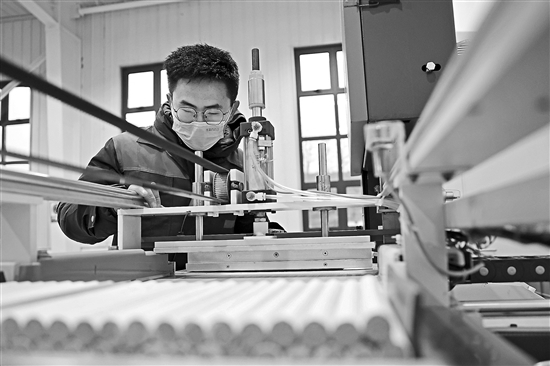 在甘肅省平?jīng)鍪徐`臺縣獨(dú)店鎮(zhèn)張鰲坡村一家艾草生產(chǎn)加工企業(yè),工人在生產(chǎn)線上作業(yè)(11月20日攝)。