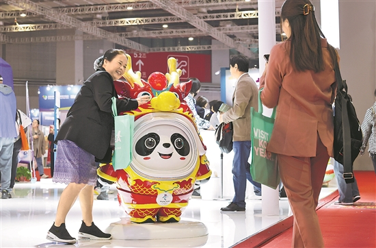 11月22日,參觀者在中國旅游集團展臺上與龍年主題裝扮的冰墩墩玩偶合影。