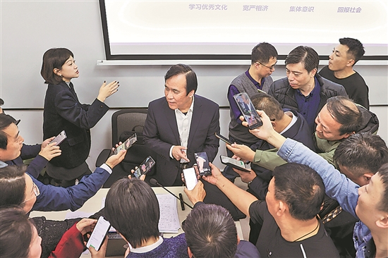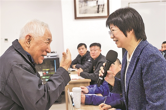 11月11日,中國工程院院士、清華大學化工科學與技術研究院院長金涌(左一)在課程結束后,回答全國勞動模范何光華的問題。