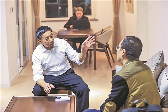 11月14日22時許,清華大學雙清公寓,培訓營學員謝大春(左一)和郭春光就“如何留住高技能人才”的問題展開討論。