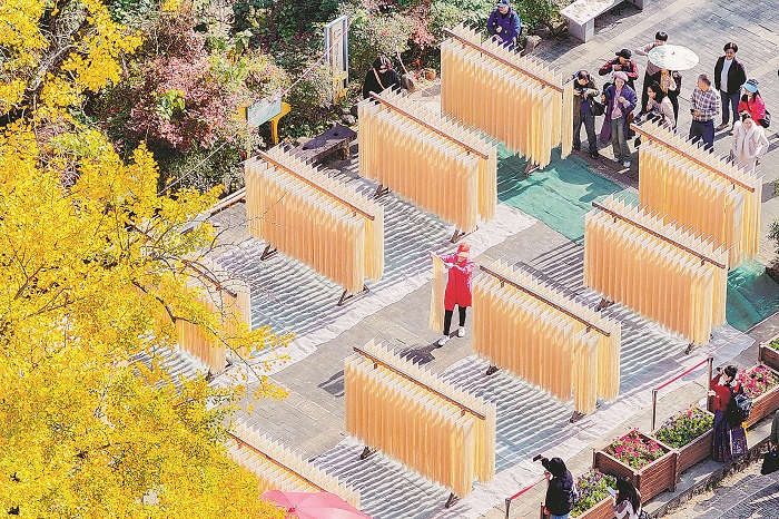 11月23日,浙江省湖州市長興縣小浦鎮(zhèn)大岕口村,村民在千年銀杏樹下晾曬銀杏面,吸引大量游客前來拍照賞景。