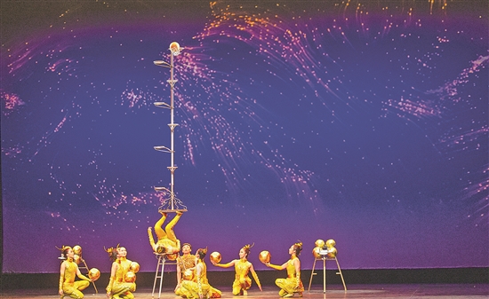 第二屆中希國際戲劇節近日在位于雅典北郊的圣誕劇場開幕。圖為在希臘雅典舉行的第二屆中希國際戲劇節上,廣州雜技團演員表演雜技《球技-金色暢想》。