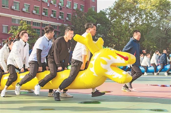 11月24日,浙江省金華市第一中等職業學校運動場上,當地企業職工在進行“齊心協力向前沖”運動比賽。