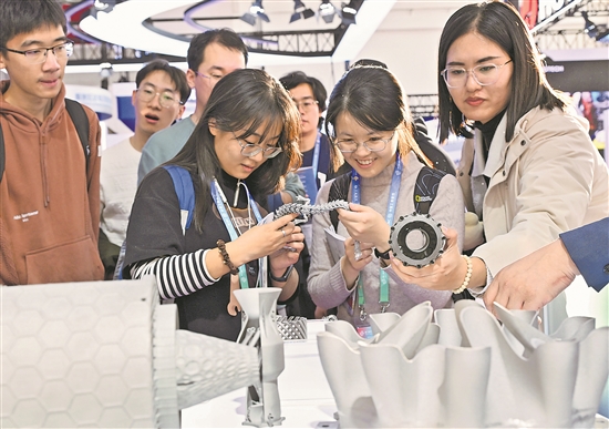 11月27日,在鏈博會先進制造鏈展區大族激光展臺,參觀者觀看激光3D打印金屬制品。