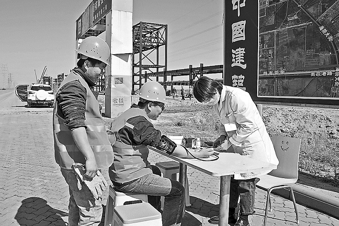 圖為建筑工人在醫護人員幫助下使用流動簡易醫療箱監測血壓,保證健康上崗。本報通訊員 紀永奇 攝