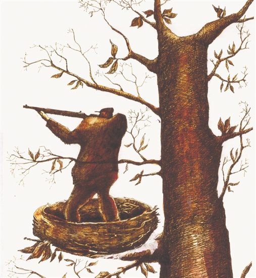“鳩占鵲巢”的獵人仍不歇手追殺可憐的鳥兒。樂極生悲的事兒找上門來了——貪婪射手占據的大樹正在斷裂,其后果可想而知。