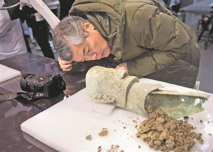 圖為在三星堆研究院,考古專家在仔細(xì)查看一件青銅面具。新華社記者 江宏景 攝