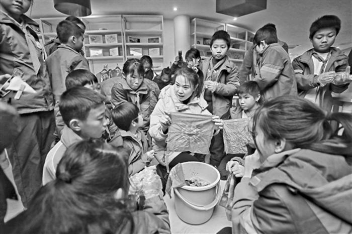 12月13日,江西省萍鄉市湘東區藝江源研學空間內,黃堂小學的學生正在體驗非遺扎染技藝。湘東區不僅是“中國民間文化藝術之鄉”,還是全國首批文化產業賦能鄉村振興試點縣區。2020年11月,“零799藝術區”落戶江口,湘東區充分利用“零799藝術”區獨特藝術資源,大力發展藝術研學之路,鼓勵學生、藝術家、村民三方互動交流。本報記者 楊登峰 攝