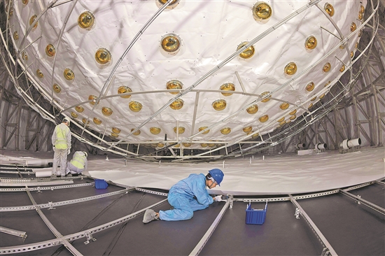 12月16日,工作人員用特衛(wèi)強紙遮蓋水池底部。 12月18日,江門中微子實驗(JUNO)液體灌注啟動,標志著該裝置建設(shè)來到最后一個關(guān)鍵節(jié)點。新華社記者 金立旺 攝