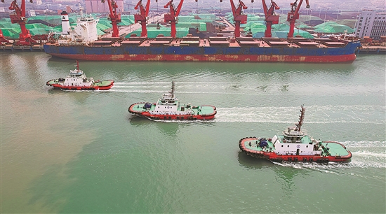 4月17日,純電拖輪“云港電拖三號”下水,其與“云港電拖一號”“云港電拖二號”共同組建為我國首支純電拖輪船隊。據國網連云港供電公司有關人士介紹,該船隊年綜合運營成本較同馬力傳統燃油拖輪節省近900萬元,等效減排二氧化碳近2700噸。本報記者 黃洪濤 本報通訊員 陳阿奇 攝