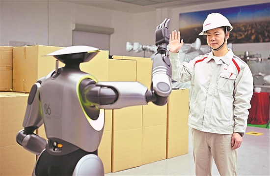 圖為位于廣州的廣汽研究院,技術人員演示人形機器人GoMate互動功能(3月18日攝)。