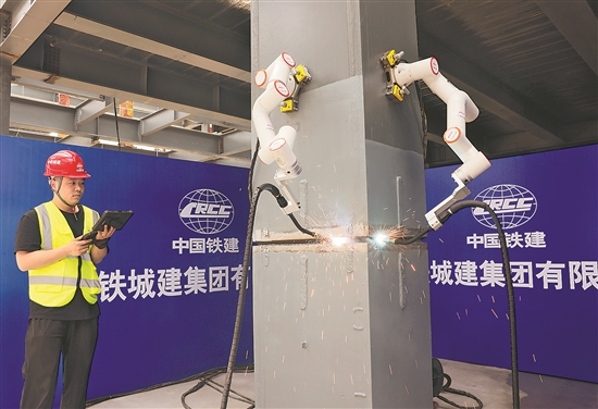 4月21日,在中鐵城建集團(tuán)湘江科學(xué)城交易展示中心項目施工現(xiàn)場,一款輕量化智能焊接機器人在技術(shù)人員的操控下正在進(jìn)行焊接施工。
