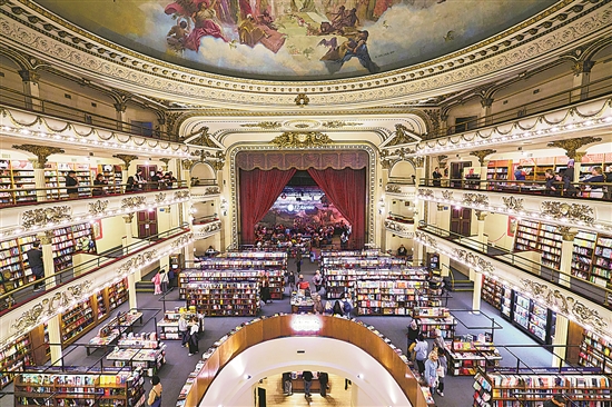 在阿根廷首都布宜諾斯艾利斯市中心的圣菲大道,有一座用建筑和文字凝結(jié)百年時光的雅典人書店。1919年,雅典人書店的前身“大光明劇院”正式落成。20世紀六七十年代,阿根廷遭遇經(jīng)濟危機,加之電影和電視的普及,大光明劇院失去了往日榮光,漸漸走向衰落。