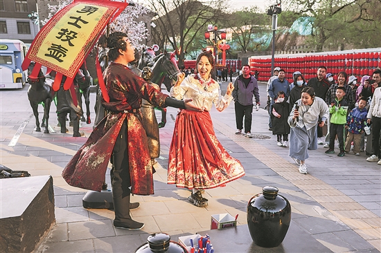 4月24日,北京市延慶區,游客在景區內與演員互動,體驗投壺游戲。
