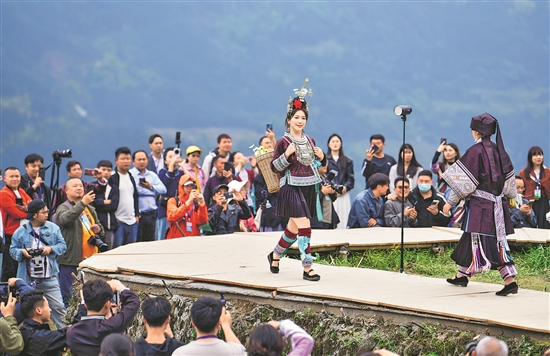 4月26日,村民在貴州省從江縣加榜梯田上參加梯田走秀活動。