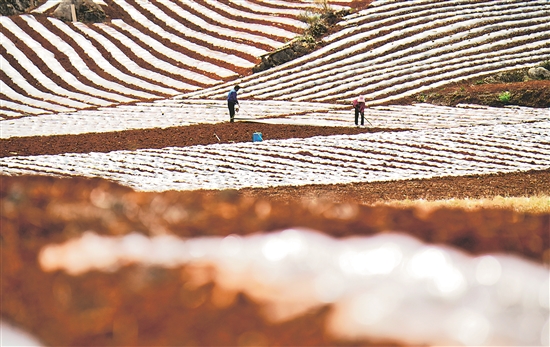 近日,云南省紅河哈尼族彝族自治州彌勒市巡檢司鎮(zhèn),農(nóng)民在田間勞作,構(gòu)成一幅優(yōu)美詩意的田園畫卷。視覺中國 供圖