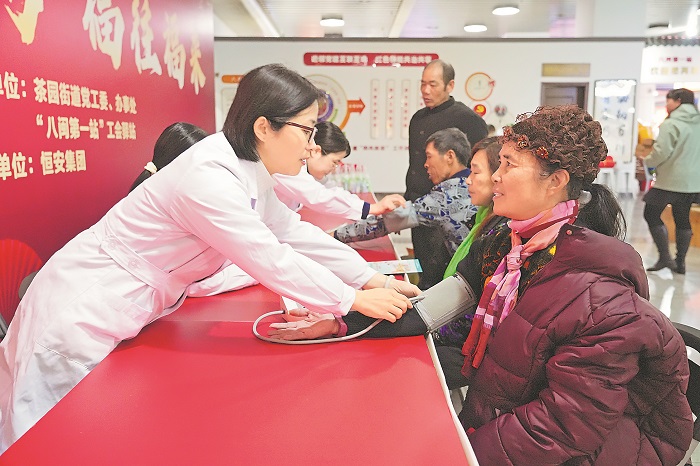 2月2日,福建福州火車站迎來春運首日客流第一波出行高峰,福州市總工會與車站、地方醫療機構建立聯動服務機制,依托“八閩第一站”工會驛站為春運旅客提供康養服務。圖為福州市茶園街道衛生服務中心工會志愿者為一名旅客測量血壓。本報記者 李潤釗 本報通訊員 江曲 攝