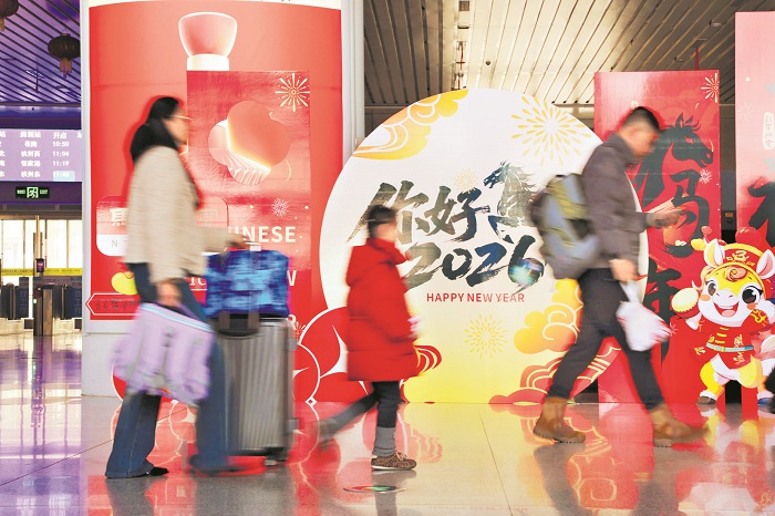 2月2日,安徽省六安火車站,出行旅客從節(jié)日氛圍濃郁的候車大廳新春主題宣傳墻前經(jīng)過。本報(bào)通訊員 田凱平 攝